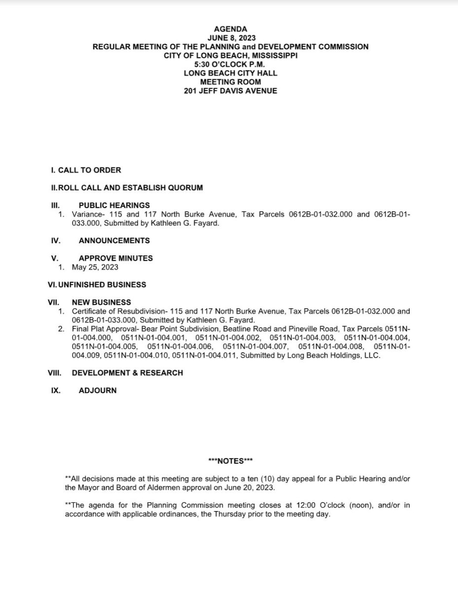 Planning & Development Commission Meeting Agenda, June 8, 2023 By superadmin | June 2, 2023 | 0 City Hall Meeting Room 201 Jeff Davis Avenue Long Beach, Mississippi 39560 Posted in Area News, Planning & Development Leave a Comment Name (required) Email (will not be published) (required) Comment Click here to cancel reply. Related Posts Community BINGO Night set for April 28 April 24, 2026 | No Comments » Community invited to gather for National Day of Prayer on May 7 April 23, 2026 | No Comments » GCCF receives Community Foundations National Standards® reaccreditation April 22, 2026 | No Comments » How To Reduce Distractions While Working Remotely April 21, 2026 | No Comments » The Biggest Packaging Challenges for Dairy Producers April 21, 2026 | No Comments »