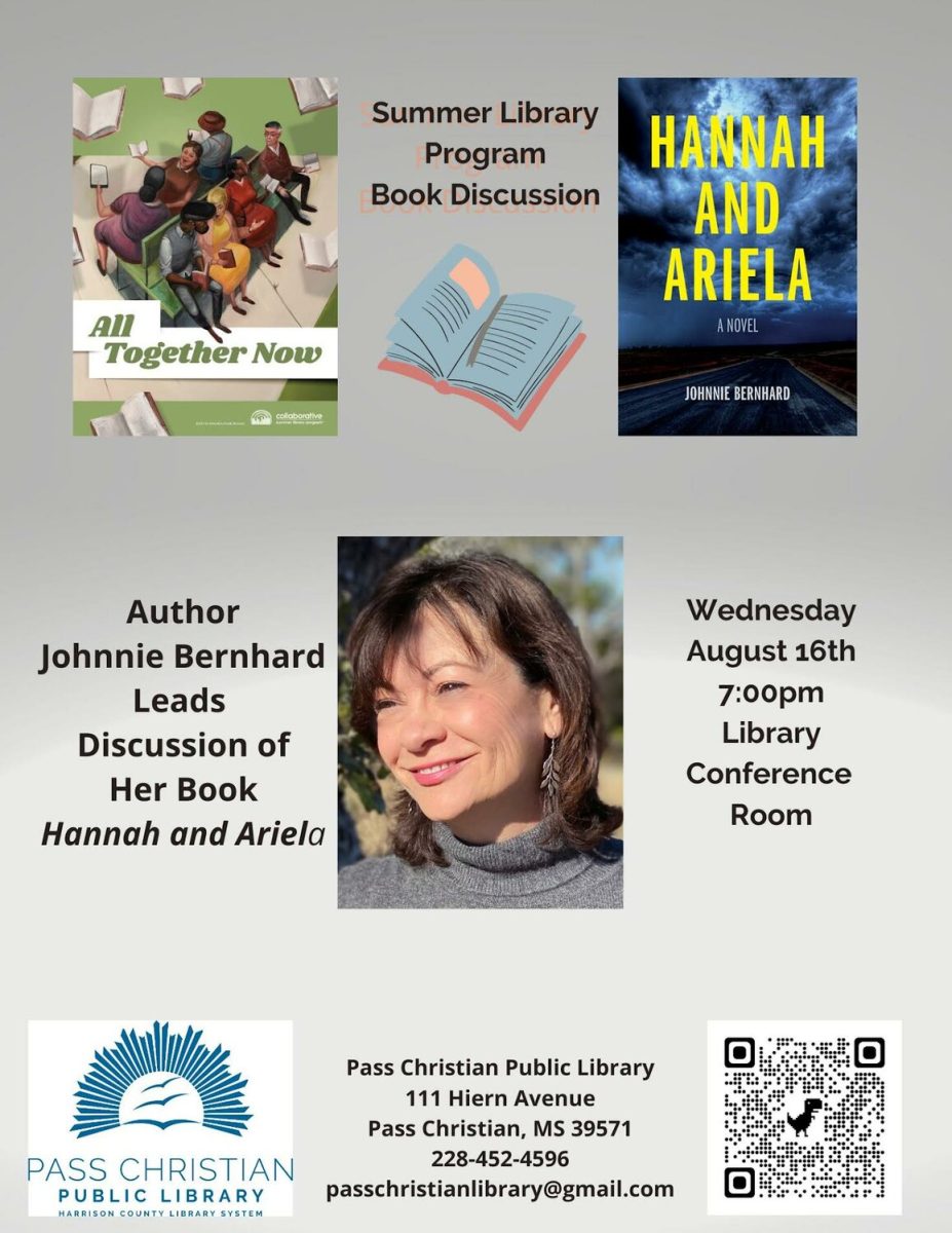 Summer Reading is not just for the kids anymore!  The theme for 2023 is “All Together Now”.  The library will host a discussion of the book Hannah and Ariela lead by the author, Johnnie Bernhard on Wednesday, August 16th at 7pm in the library conference room. A former English teacher, Johnnie Bernhard is the author of the award-winning books A Good Girl, How We Came to Be, Sisters of the Undertow and her latest title (and the subject of our discussion) Hannah and Ariela.  This is the story of one woman’s bravery in rescuing another, only to rise phoenix-like into a newly defined, far-reaching life purpose (Claire Fullerton, New York Journal of Books).