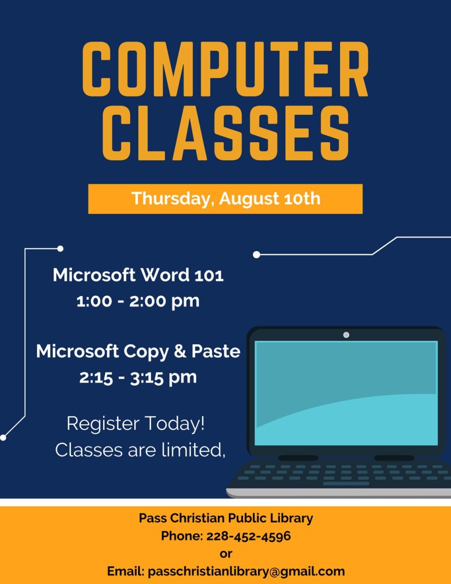 These classes will be held on Thursday, August 10th at the times listed above in the Conference Room at the Pass Christian Library located at 111 Hiern Avenue. These classes are free and open to the public! However, class size is limited. To reserve a spot or for further information, please call the Pass Christian Public Library at 228-452-4596 or email at passchristianlibrary@gmail.com.