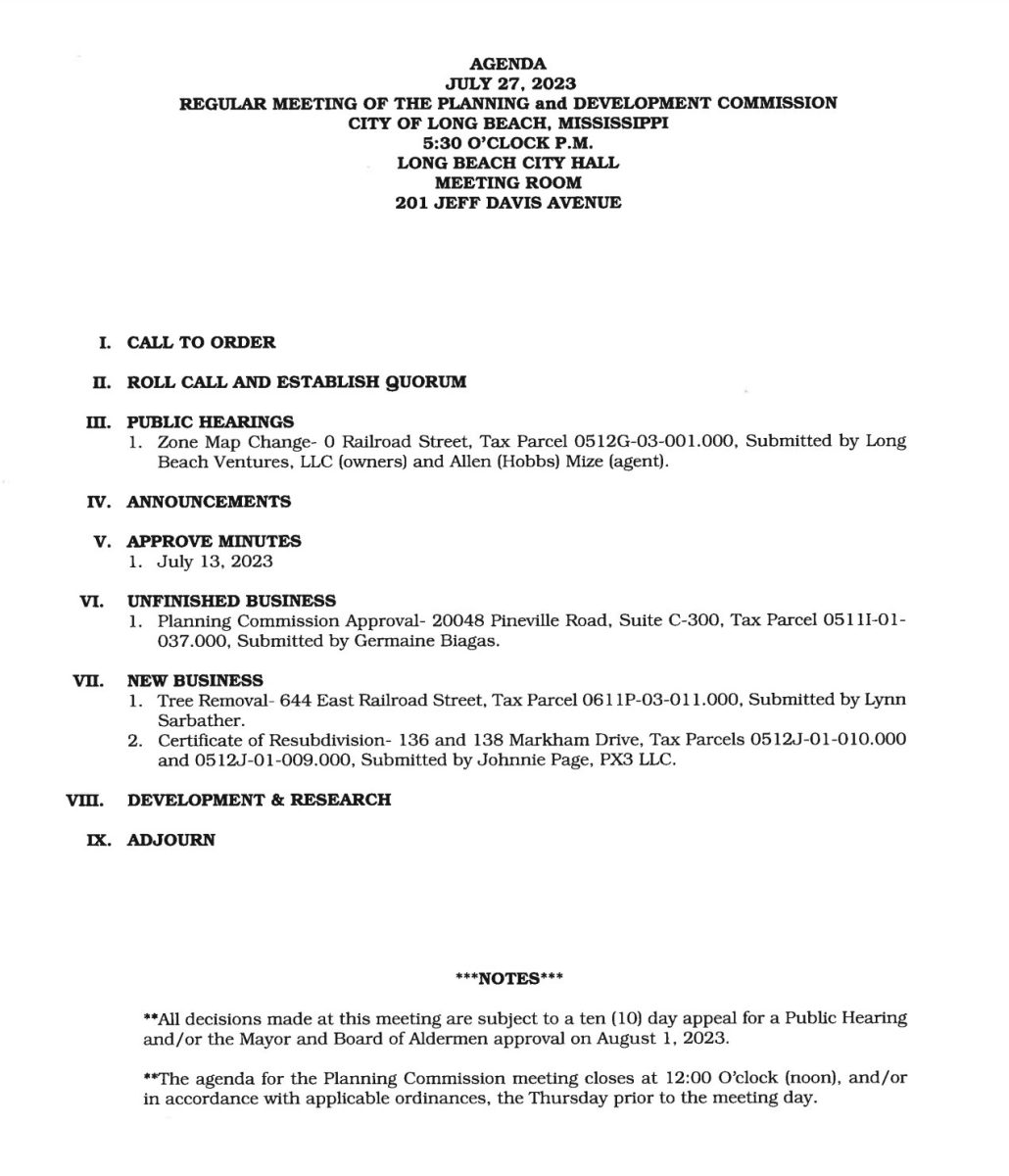 Planning & Development Commission Meeting Agenda, July 27, 2023 By superadmin | July 21, 2023 | 0 City Hall Meeting Room 201 Jeff Davis Avenue Long Beach, Mississippi 39560 Posted in Planning & Development Leave a Comment Name (required) Email (will not be published) (required) Comment Click here to cancel reply. Related Posts Planning and Development Commission Meeting Agenda, February 26, 2026 February 23, 2026 | No Comments » Planning and Development Commission Meeting Agenda, February 12, 2026 February 9, 2026 | No Comments » Signs That Your Building’s HVAC System Needs Maintenance January 15, 2026 | No Comments » Planning and Development Commission Agenda, January 8, 2026 January 6, 2026 | No Comments » Common Challenges in the Cosmetics Supply Chain December 31, 2025 | No Comments »