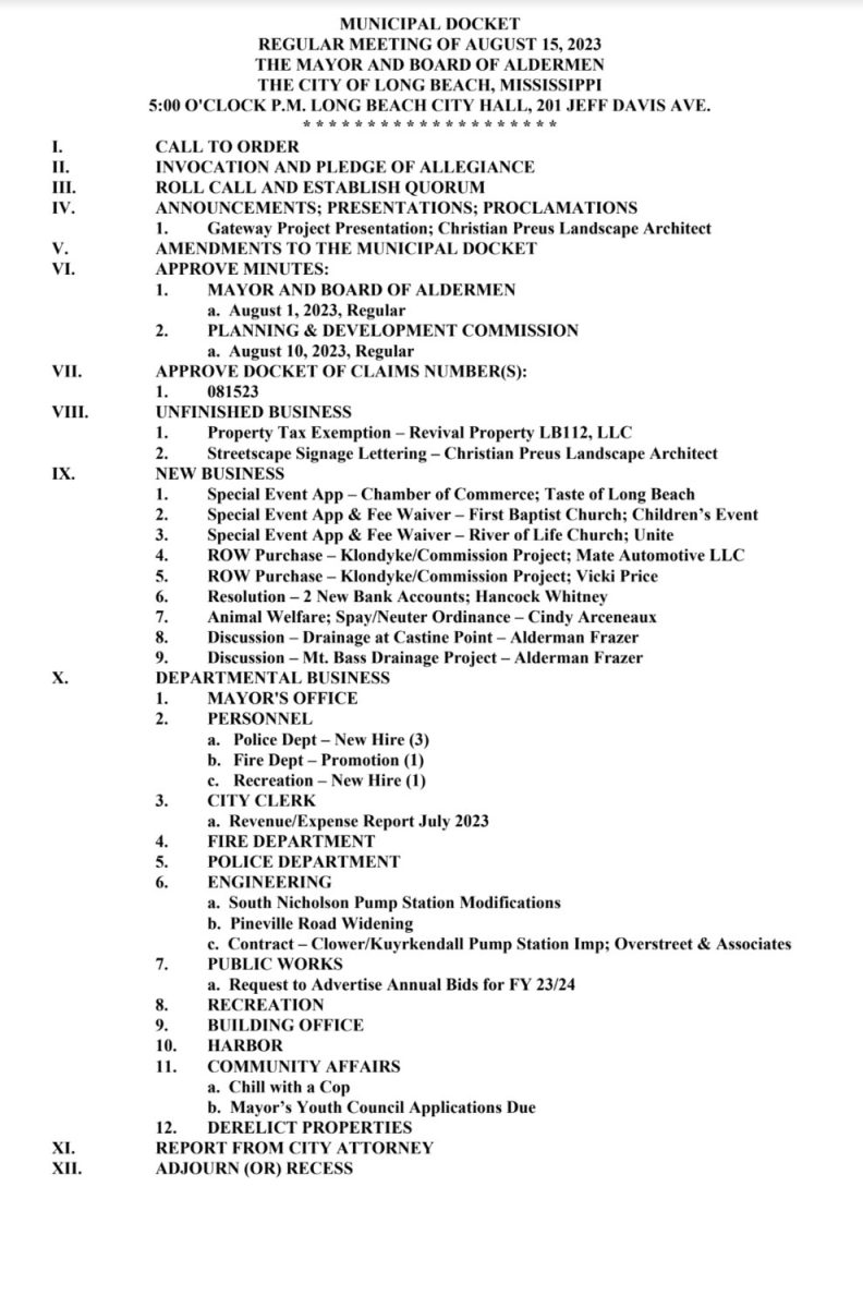 Mayor & Board of Aldermen Meeting Agenda, August 15, 2023