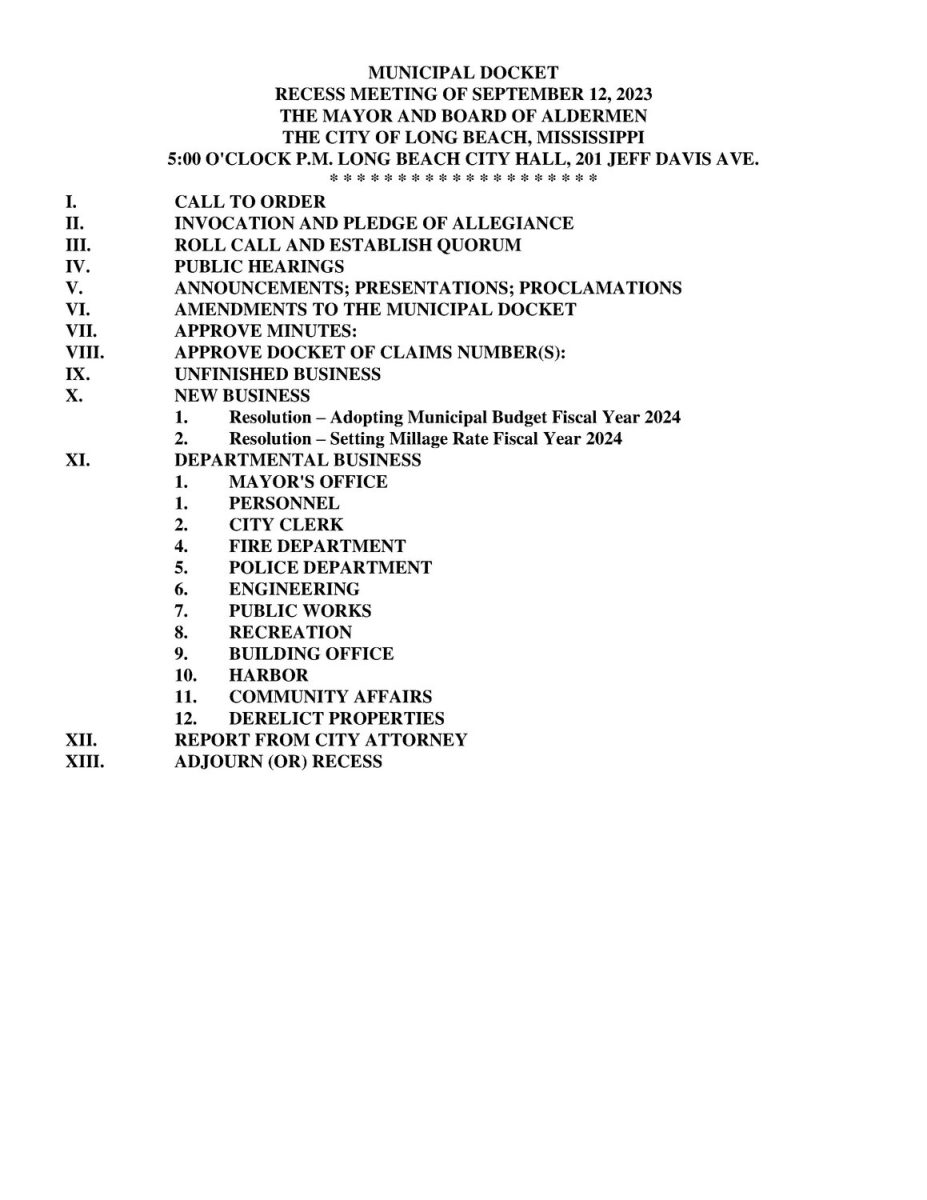 Mayor and Board of Aldermen Meeting Agenda, September 12, 2023 By superadmin | September 12, 2023 | 0 Mayor and Board of Alderman Meeting Agenda, September 12, 2023 at 5:00 PM City Hall Meeting Room 201 Jeff Davis Avenue Long Beach, MS 39560 Posted in Mayor's Board of Aldermen Leave a Comment Name (required) Email (will not be published) (required) Comment Click here to cancel reply. Related Posts Mayor and Board of Aldermen Meeting Agenda for Tuesday, March 17, 2026 March 16, 2026 | No Comments » Mayor and Board of Aldermen Meeting Agenda, Tuesday, February 3, 2026 February 2, 2026 | No Comments » Mayor and Board of Aldermen Meeting Agenda, January 6, 2026 January 6, 2026 | No Comments » Mayor and Board of Aldermen Meeting Agenda, December 16, 2025 December 18, 2025 | No Comments » Mayor and Board of Aldermen Meeting Agenda, December 2, 2025 December 5, 2025 | No Comments »
