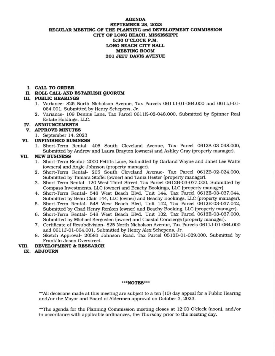 Planning and Development Commission Agenda, September 28, 2023 By superadmin | September 25, 2023 | 0 City Hall Meeting Room 201 Jeff Davis Avenue Long Beach, MS 39560 Posted in Planning & Development Leave a Comment Name (required) Email (will not be published) (required) Comment Click here to cancel reply. Related Posts Planning and Development Commission Meeting Agenda, February 26, 2026 February 23, 2026 | No Comments » Planning and Development Commission Meeting Agenda, February 12, 2026 February 9, 2026 | No Comments » Signs That Your Building’s HVAC System Needs Maintenance January 15, 2026 | No Comments » Planning and Development Commission Agenda, January 8, 2026 January 6, 2026 | No Comments » Common Challenges in the Cosmetics Supply Chain December 31, 2025 | No Comments »