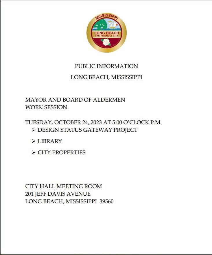 Mayor and Board of Aldermen Work Session Agenda, October 24, 2023 By superadmin | October 9, 2023 | 0 Mayor and Board of Aldermen Work Session Agenda, October 24, 2023, at 5:00 P.M. City Hall Meeting Room 201 Jeff Davis Avenue Long Beach, MS 39560 Posted in Area News, Mayor's Board of Aldermen Leave a Comment Name (required) Email (will not be published) (required) Comment Click here to cancel reply. Related Posts Community BINGO Night set for April 28 April 24, 2026 | No Comments » Community invited to gather for National Day of Prayer on May 7 April 23, 2026 | No Comments » GCCF receives Community Foundations National Standards® reaccreditation April 22, 2026 | No Comments » How To Reduce Distractions While Working Remotely April 21, 2026 | No Comments » The Biggest Packaging Challenges for Dairy Producers April 21, 2026 | No Comments »