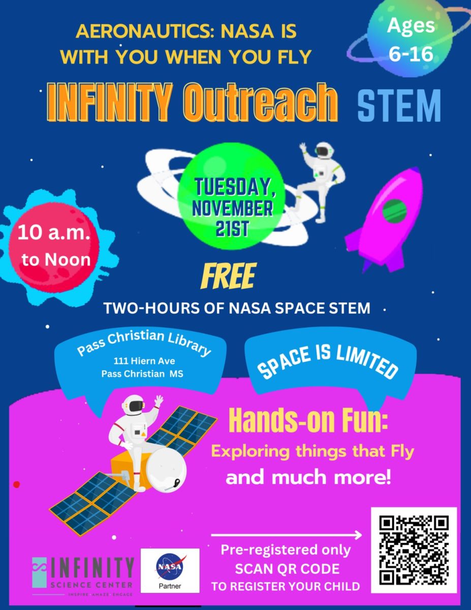 DETAILS: Infinity Outreach STEM Program is coming to the library! It’s a 2-hour hands-on experience where kids aged 6-16 get to explore all sorts of things related to flight and more. The event is happening at the Pass Christian Library on November 21, 2023, from 10 a.m. to noon. Space is limited, so make sure to pre-register to secure your child’s spot by scanning the QR code.