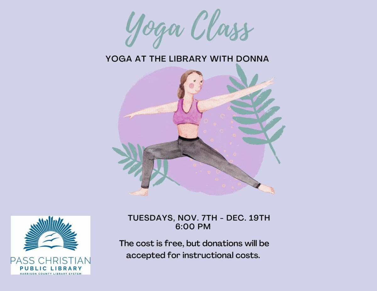The Pass Christian Library is excited to announce a new Yoga with Donna Series on Tuesdays at 6pm beginning on Tuesday, November 7th. The series will continue each Tuesday through December 19th. Our instructor, Donna, will incorporate physical postures, breath work and meditation. Postures will be adapted to individual ability. One hour sessions begin promptly at 6:00 p.m. in the conference room of the library located at 111 Hiern Avenue in Pass Christian. Please wear comfortable clothes and bring an exercise mat. The cost is free, but donations will be accepted for instructional costs.