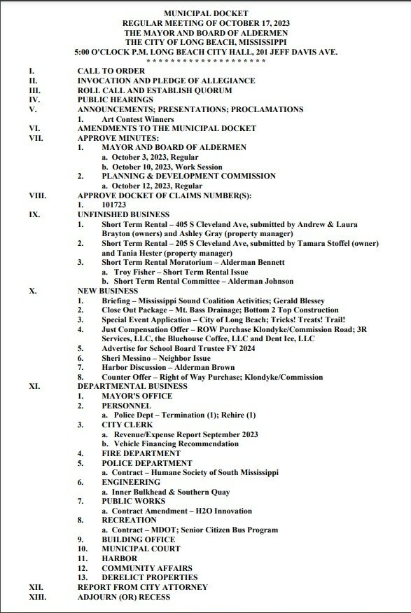 Mayor and Board of Aldermen Meeting Agenda, October 17, 2023