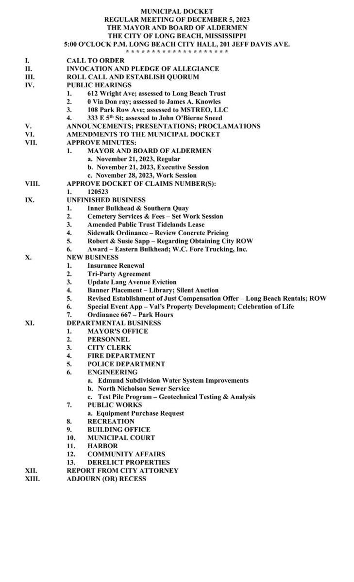 Mayor and Board of Alderman Agenda, December 5, 2023 By superadmin | December 4, 2023 | 0 Mayor and Board of Alderman Meeting Agenda, December 5, 2023 @ 5:00 P.M. City Hall Meeting Room201 Jeff Davis AvenueLong Beach, MS 39560 Posted in Area News, Mayor's Board of Aldermen Leave a Comment Name (required) Email (will not be published) (required) Comment Click here to cancel reply. Related Posts Community BINGO Night set for April 28 April 24, 2026 | No Comments » Community invited to gather for National Day of Prayer on May 7 April 23, 2026 | No Comments » GCCF receives Community Foundations National Standards® reaccreditation April 22, 2026 | No Comments » How To Reduce Distractions While Working Remotely April 21, 2026 | No Comments » The Biggest Packaging Challenges for Dairy Producers April 21, 2026 | No Comments »