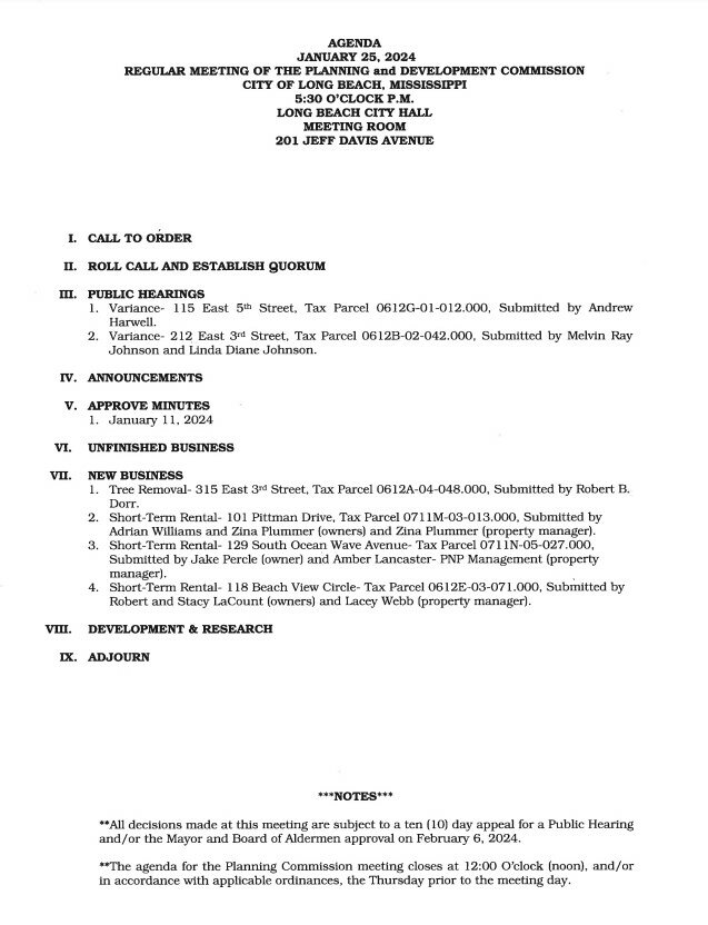 Planning and Development Commission Agenda, January 25, 2024 By superadmin | January 23, 2024 | 0 Planning and Development Commission Agenda, January 25, 2024 @ 5:30 PM City Hall Meeting Room201 Jeff Davis AvenueLong Beach, MS 39560 Posted in Area News, Planning & Development Leave a Comment Name (required) Email (will not be published) (required) Comment Click here to cancel reply. Related Posts Community invited to gather for National Day of Prayer on May 7 April 23, 2026 | No Comments » GCCF receives Community Foundations National Standards® reaccreditation April 22, 2026 | No Comments » How To Reduce Distractions While Working Remotely April 21, 2026 | No Comments » The Biggest Packaging Challenges for Dairy Producers April 21, 2026 | No Comments » Baleyev assists at State Capitol April 21, 2026 | No Comments »