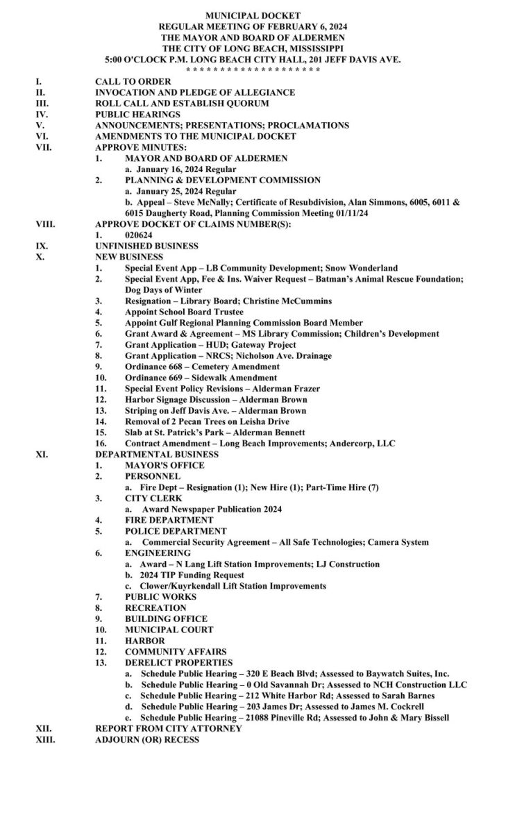 Mayor and Board of Aldermen Meeting Agenda, February 6, 2024