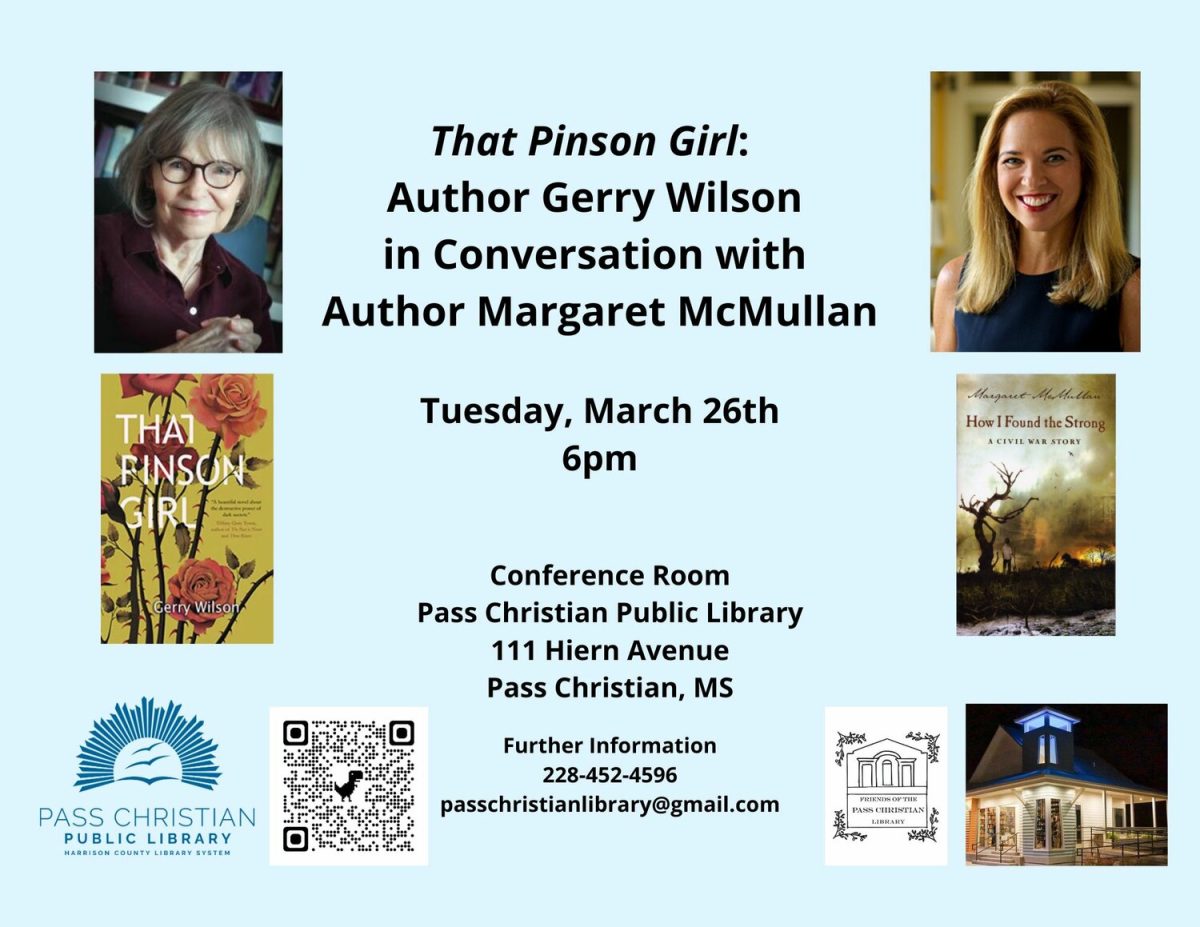 March 26 will bring a special dual-author event to the Pass Christian Public Library. Beginning at 6 p.m., two Mississippi authors, Gerry Wilson and Margaret McMullan, will have a conversation about Wilson’s debut novel, That Pinson Girl, and McMullan’s novel, How I Found the Strong. Both are historical fiction books that are set in Mississippi.