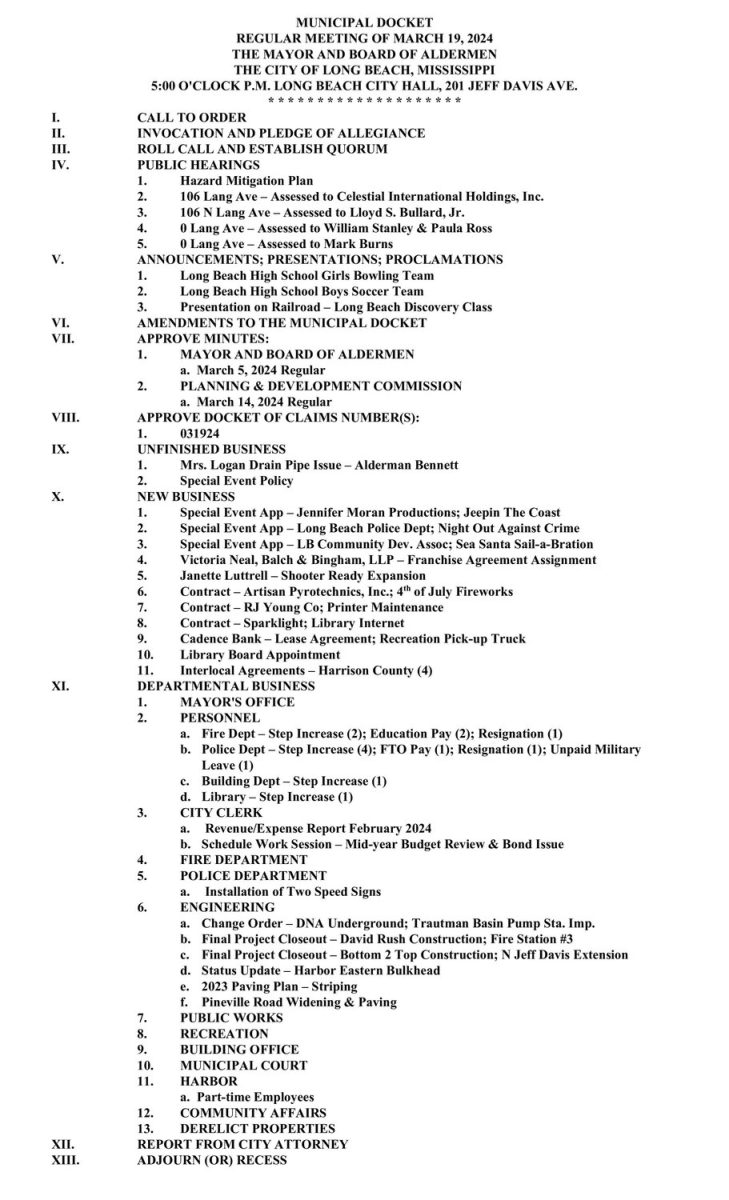 Mayor and Board of Aldermen Meeting Agenda, March 19, 2024 By superadmin | March 19, 2024 | 0 Mayor and Board of Aldermen Meeting Agenda, March 19, 2024 @5:00 PM City Hall Meeting Room201 Jeff Davis AveLong Beach, MS 39560 Posted in Area News, Mayor's Board of Aldermen Leave a Comment Name (required) Email (will not be published) (required) Comment Click here to cancel reply. Related Posts Community BINGO Night set for April 28 April 24, 2026 | No Comments » Community invited to gather for National Day of Prayer on May 7 April 23, 2026 | No Comments » GCCF receives Community Foundations National Standards® reaccreditation April 22, 2026 | No Comments » How To Reduce Distractions While Working Remotely April 21, 2026 | No Comments » The Biggest Packaging Challenges for Dairy Producers April 21, 2026 | No Comments »