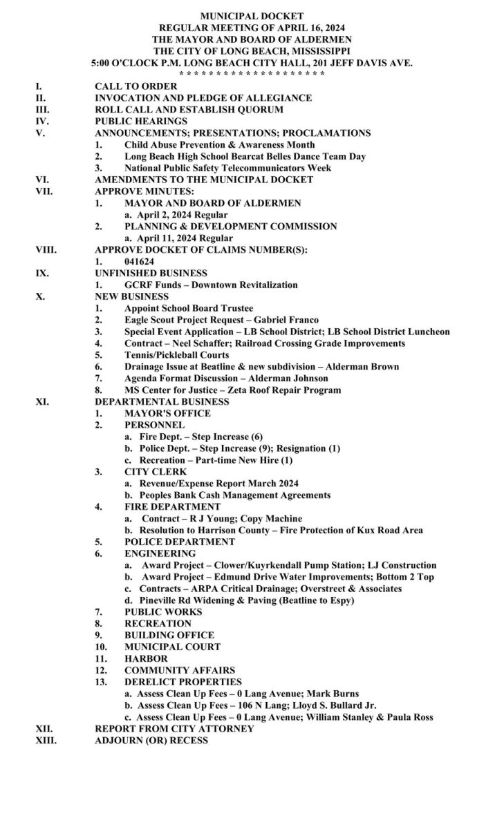 Mayor and Board of Aldermen Meeting Amended Agenda, April 16, 2024