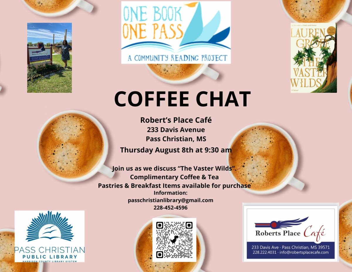 The August 8 Coffee Chat will be held from 9:30 until 11 a.m. at Roberts Place Café. Coffee and tea will be provided, and pastries and breakfast items will be available for purchase during the discussion. The Café is located at 233 Davis Avenue in downtown Pass Christian. Copies of The Vaster Wilds are available for check out at the Pass Christian Library or for purchase at Pass Christian Books. Those with questions or needing more information are encouraged to call the library at 228-452-4596, or email PassChristianLibrary@gmail.com.