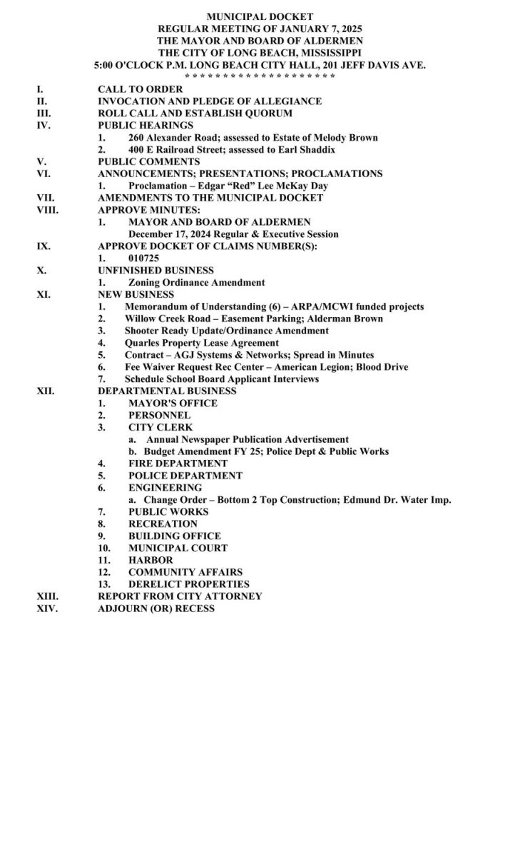 Mayor and Board of Aldermen Agenda, Thursday, January 07, 2025 By superadmin | January 13, 2025 | 0 Mayor and Board of Aldermen Agenda, Thursday, January 07, 2025 @ 5:00 PM City Hall Meeting Room201 Jeff Davis AvenueLong Beach, MS 39560 Posted in Mayor's Board of Aldermen Leave a Comment Name (required) Email (will not be published) (required) Comment Click here to cancel reply. Related Posts Mayor and Board of Aldermen Meeting Agenda for Tuesday, March 17, 2026 March 16, 2026 | No Comments » Mayor and Board of Aldermen Meeting Agenda, Tuesday, February 3, 2026 February 2, 2026 | No Comments » Mayor and Board of Aldermen Meeting Agenda, January 6, 2026 January 6, 2026 | No Comments » Mayor and Board of Aldermen Meeting Agenda, December 16, 2025 December 18, 2025 | No Comments » Mayor and Board of Aldermen Meeting Agenda, December 2, 2025 December 5, 2025 | No Comments »