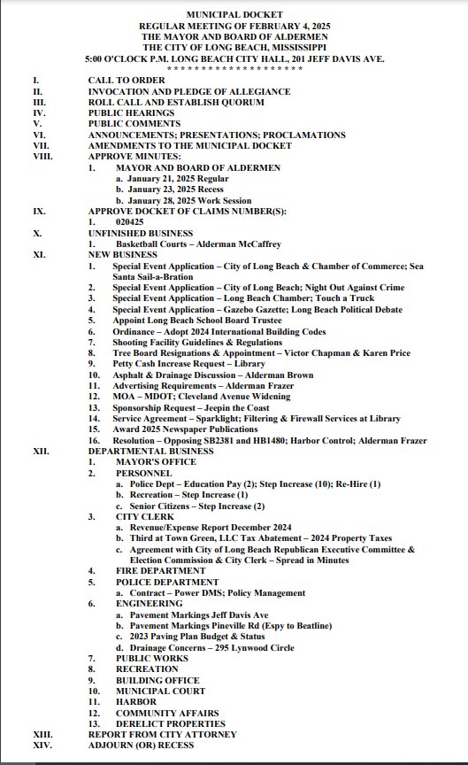 Mayor and Board of Aldermen Meeting Agenda, Tuesday, February 4, 2025 By superadmin | February 3, 2025 | 0 Mayor and Board of Aldermen Meeting Agenda, Tuesday, February 4, 2025 @ 5:00 PM City Hall Meeting Room201 Jeff Davis AvenueLong Beach, MS 39560 Posted in Mayor's Board of Aldermen Leave a Comment Name (required) Email (will not be published) (required) Comment Click here to cancel reply. Related Posts Mayor and Board of Aldermen Meeting Agenda for Tuesday, March 17, 2026 March 16, 2026 | No Comments » Mayor and Board of Aldermen Meeting Agenda, Tuesday, February 3, 2026 February 2, 2026 | No Comments » Mayor and Board of Aldermen Meeting Agenda, January 6, 2026 January 6, 2026 | No Comments » Mayor and Board of Aldermen Meeting Agenda, December 16, 2025 December 18, 2025 | No Comments » Mayor and Board of Aldermen Meeting Agenda, December 2, 2025 December 5, 2025 | No Comments »