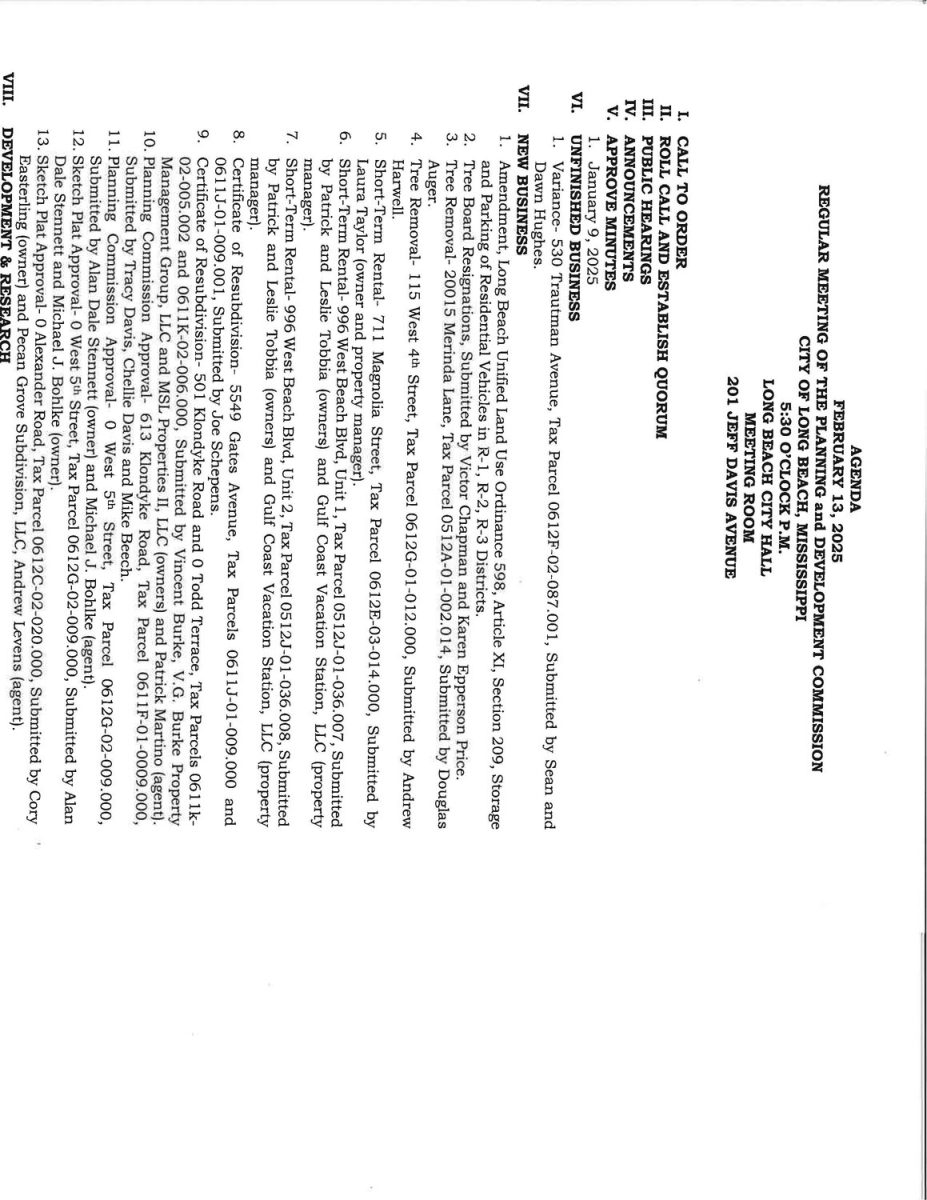 Planning and Development Commission Agenda, February 13, 2025 By superadmin | February 6, 2025 | 0 Planning and Development Commission Agenda, February 13, 2025 @ 5:30 PM City Hall Meeting Room201 Jeff Davis AvenueLong Beach, MS 39560 Posted in Planning & Development Leave a Comment Name (required) Email (will not be published) (required) Comment Click here to cancel reply. Related Posts Planning and Development Commission Meeting Agenda, February 26, 2026 February 23, 2026 | No Comments » Planning and Development Commission Meeting Agenda, February 12, 2026 February 9, 2026 | No Comments » Signs That Your Building’s HVAC System Needs Maintenance January 15, 2026 | No Comments » Planning and Development Commission Agenda, January 8, 2026 January 6, 2026 | No Comments » Common Challenges in the Cosmetics Supply Chain December 31, 2025 | No Comments »