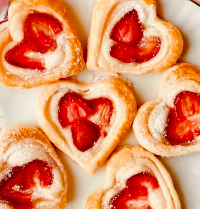 Roll out a sheet of crescent roll dough (pinch edges together if not using a sheet) on a floured surface. Roll both long edges up to meet in the middle. Cut roll into 1-inch slices. Pinch the bottom of each slice into a point to resemble a heart. Place heart-shaped slice onto a lightly-greased baking sheet, then gently press down on dough to create a heart shape inside edges.