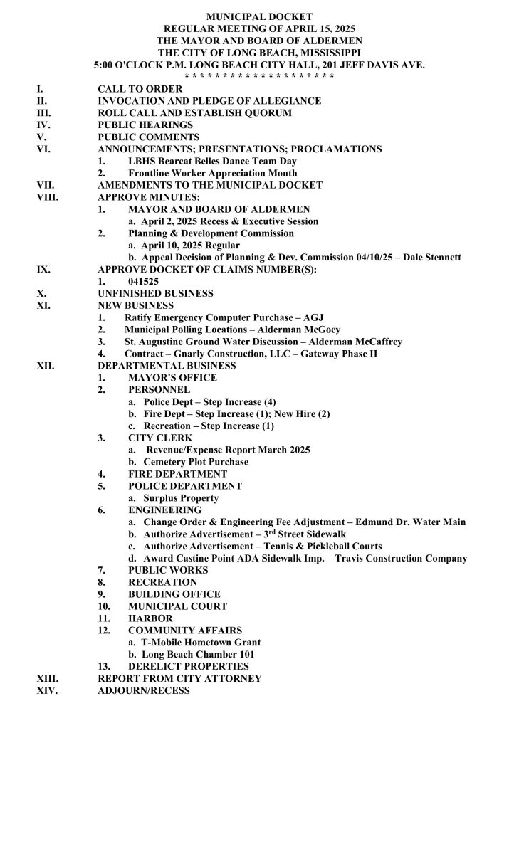 Mayor and Board of Aldermen Meeting Agenda, April 15, 2025 By Editor | April 14, 2025 | 0 Mayor and Board of Aldermen Meeting Agenda, April 15, 2025 @ 5:00 PM City Hall Meeting Room }201 Jeff Davis Ave Long Beach, MS 39560 Posted in Mayor's Board of Aldermen Leave a Comment Name (required) Email (will not be published) (required) Comment Click here to cancel reply. Related Posts Mayor and Board of Aldermen Meeting Agenda for Tuesday, March 17, 2026 March 16, 2026 | No Comments » Mayor and Board of Aldermen Meeting Agenda, Tuesday, February 3, 2026 February 2, 2026 | No Comments » Mayor and Board of Aldermen Meeting Agenda, January 6, 2026 January 6, 2026 | No Comments » Mayor and Board of Aldermen Meeting Agenda, December 16, 2025 December 18, 2025 | No Comments » Mayor and Board of Aldermen Meeting Agenda, December 2, 2025 December 5, 2025 | No Comments »
