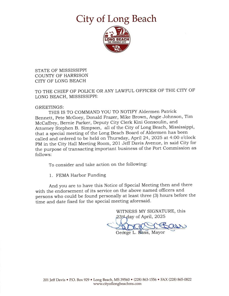 Notice of Special Meeting of the Mayor and Board of Aldermen, April 24, 2025 By Editor | April 24, 2025 | 0 Notice of Special Meeting of the Mayor and Board of Aldermen, April 24, 2025 @ 4:00 PM City Hall Meeting Room 201 Jeff Davis Avenue Long Beach, MS 39560 Posted in Mayor's Board of Aldermen Leave a Comment Name (required) Email (will not be published) (required) Comment Click here to cancel reply. Related Posts Mayor and Board of Aldermen Meeting Agenda for Tuesday, March 17, 2026 March 16, 2026 | No Comments » Mayor and Board of Aldermen Meeting Agenda, Tuesday, February 3, 2026 February 2, 2026 | No Comments » Mayor and Board of Aldermen Meeting Agenda, January 6, 2026 January 6, 2026 | No Comments » Mayor and Board of Aldermen Meeting Agenda, December 16, 2025 December 18, 2025 | No Comments » Mayor and Board of Aldermen Meeting Agenda, December 2, 2025 December 5, 2025 | No Comments »