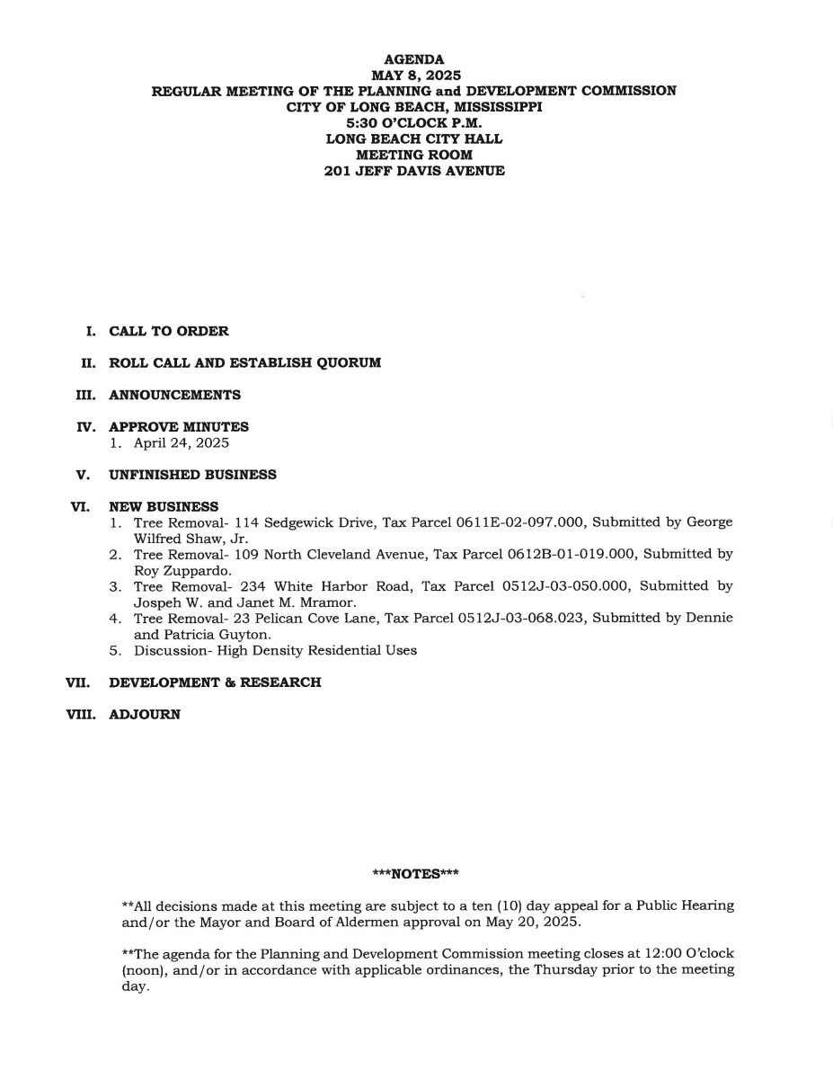 Planning and Development Commission Meeting Agenda, May 8, 2025 By Editor | May 2, 2025 | 0 Planning and Development Commission Meeting Agenda, May 8, 2025 City Hall Meeting Room 201 Jeff Davis Ave Long Beach, MS 39560 Posted in Planning & Development Leave a Comment Name (required) Email (will not be published) (required) Comment Click here to cancel reply. Related Posts Planning and Development Commission Meeting Agenda, February 26, 2026 February 23, 2026 | No Comments » Planning and Development Commission Meeting Agenda, February 12, 2026 February 9, 2026 | No Comments » Signs That Your Building’s HVAC System Needs Maintenance January 15, 2026 | No Comments » Planning and Development Commission Agenda, January 8, 2026 January 6, 2026 | No Comments » Common Challenges in the Cosmetics Supply Chain December 31, 2025 | No Comments »
