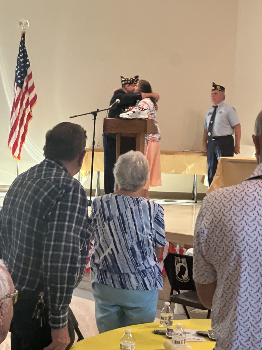 Gold Star Mother (of SSgt. Donnie Levens) Margaret Levens receives a hug from Long Beach American Legion Commander Ray Chavaree and a standing ovation at the April 10th ceremony. In the foreground, sitting on the podium, is one of SSgt. Donnie Levens’s size 16 shoes.