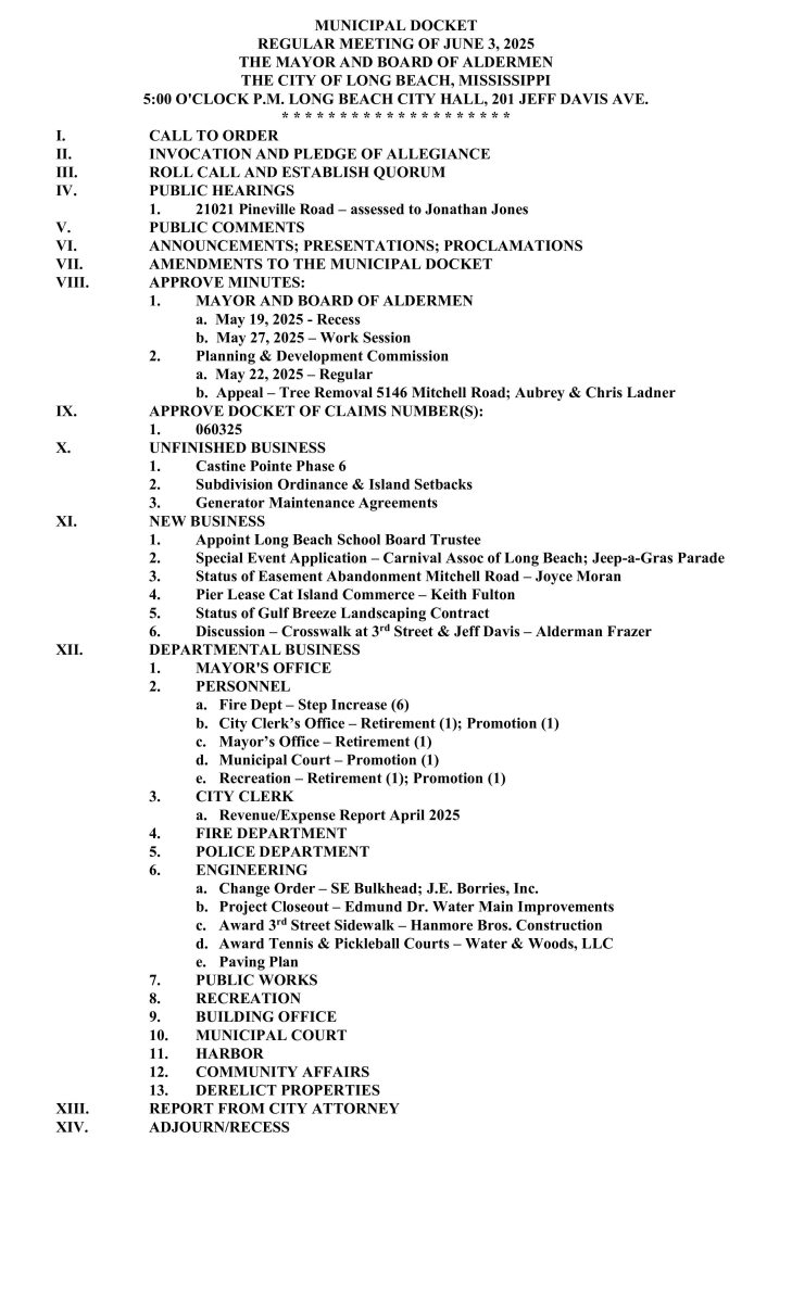 Mayor and Board of Aldermen Meeting Agenda, June 3, 2025 By Editor | June 3, 2025 | 0 Mayor and Board of Aldermen Meeting Agenda, June 3, 2025 @ 5:00pm City Hall Meeting Room 201 Jeff Davis Ave Long Beach, MS 39560 Posted in Breaking News, Mayor's Board of Aldermen Leave a Comment Name (required) Email (will not be published) (required) Comment Click here to cancel reply. Related Posts Community invited to gather for National Day of Prayer on May 7 April 23, 2026 | No Comments » GCCF receives Community Foundations National Standards® reaccreditation April 22, 2026 | No Comments » Baleyev assists at State Capitol April 21, 2026 | No Comments » City establishes temporary permit process for existing business containers April 16, 2026 | No Comments » MISSISSIPPI GULF COAST CHAMBER OF COMMERCE OPENS 2026 SMALL BUSINESS GRANT APPLICATIONS April 15, 2026 | No Comments »