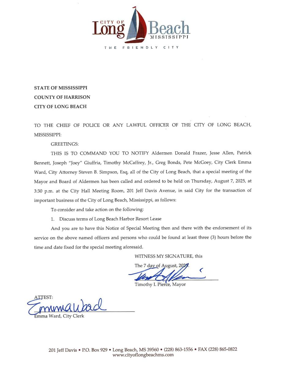 Notice of Special Meeting of the Mayor and Board of Aldermen, August 7, 2025 By Editor | August 7, 2025 | 0 Notice of Special Meeting of the Mayor and Board of Aldermen, August 7, 2025 City Hall Meeting Room 201 Jeff Davis Avenue Long Beach, MS 39560 Posted in Mayor's Board of Aldermen Leave a Comment Name (required) Email (will not be published) (required) Comment Click here to cancel reply. Related Posts Mayor and Board of Aldermen Meeting Agenda for Tuesday, March 17, 2026 March 16, 2026 | No Comments » Mayor and Board of Aldermen Meeting Agenda, Tuesday, February 3, 2026 February 2, 2026 | No Comments » Mayor and Board of Aldermen Meeting Agenda, January 6, 2026 January 6, 2026 | No Comments » Mayor and Board of Aldermen Meeting Agenda, December 16, 2025 December 18, 2025 | No Comments » Mayor and Board of Aldermen Meeting Agenda, December 2, 2025 December 5, 2025 | No Comments »