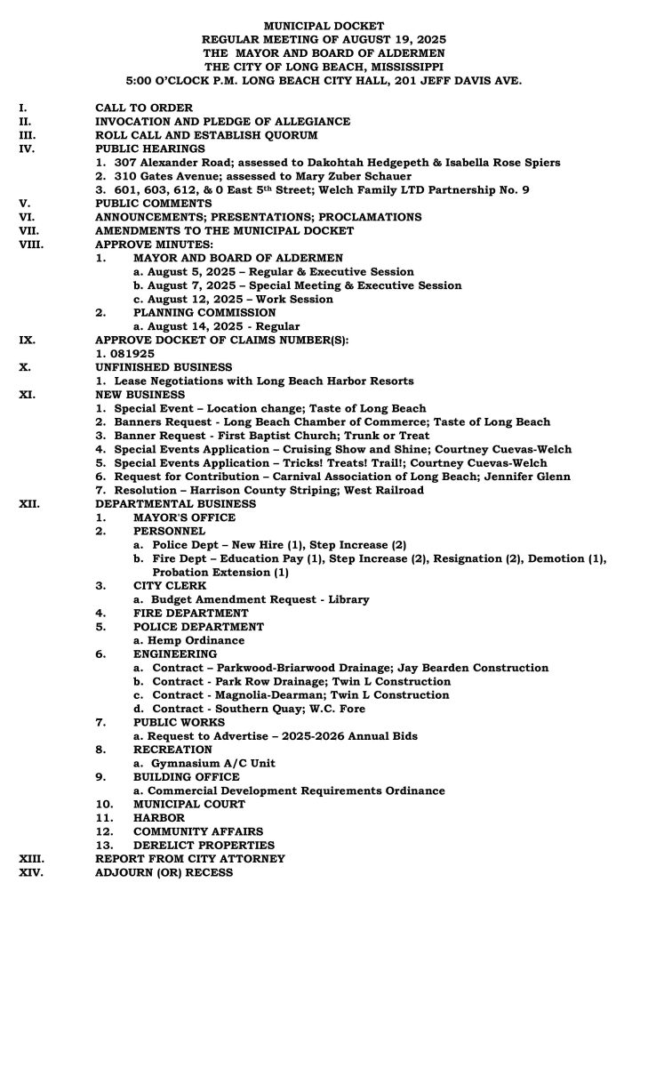 Mayor and Board of Aldermen Meeting Agenda, August 19, 2025 By Editor | August 18, 2025 | 0 Mayor and Board of Aldermen Meeting Agenda, August 19, 2025 @ 5:00 PM City Hall Meeting Room 201 Jeff Davis Avenue Long Beach, MS 39560 Posted in Mayor's Board of Aldermen Leave a Comment Name (required) Email (will not be published) (required) Comment Click here to cancel reply. Related Posts Mayor and Board of Aldermen Meeting Agenda for Tuesday, March 17, 2026 March 16, 2026 | No Comments » Mayor and Board of Aldermen Meeting Agenda, Tuesday, February 3, 2026 February 2, 2026 | No Comments » Mayor and Board of Aldermen Meeting Agenda, January 6, 2026 January 6, 2026 | No Comments » Mayor and Board of Aldermen Meeting Agenda, December 16, 2025 December 18, 2025 | No Comments » Mayor and Board of Aldermen Meeting Agenda, December 2, 2025 December 5, 2025 | No Comments »