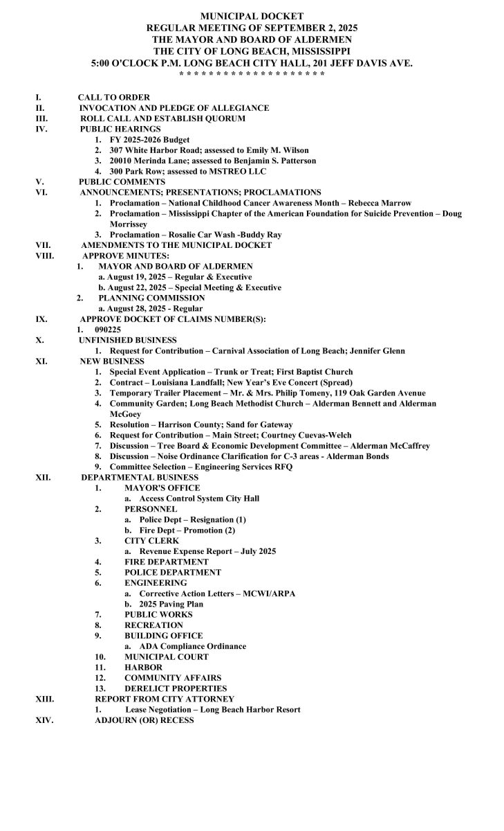 Mayor and Board of Aldermen Meeting Agenda, September 2, 2025 By Editor | September 2, 2025 | 0 Mayor and Board of Aldermen Meeting Agenda, September 2, 2025 @5:00 PM City Hall Meeting Room 201 Jeff Davis Avenue Long Beach, MS 39560 Posted in Mayor's Board of Aldermen Leave a Comment Name (required) Email (will not be published) (required) Comment Click here to cancel reply. Related Posts Mayor and Board of Aldermen Meeting Agenda for Tuesday, March 17, 2026 March 16, 2026 | No Comments » Mayor and Board of Aldermen Meeting Agenda, Tuesday, February 3, 2026 February 2, 2026 | No Comments » Mayor and Board of Aldermen Meeting Agenda, January 6, 2026 January 6, 2026 | No Comments » Mayor and Board of Aldermen Meeting Agenda, December 16, 2025 December 18, 2025 | No Comments » Mayor and Board of Aldermen Meeting Agenda, December 2, 2025 December 5, 2025 | No Comments »