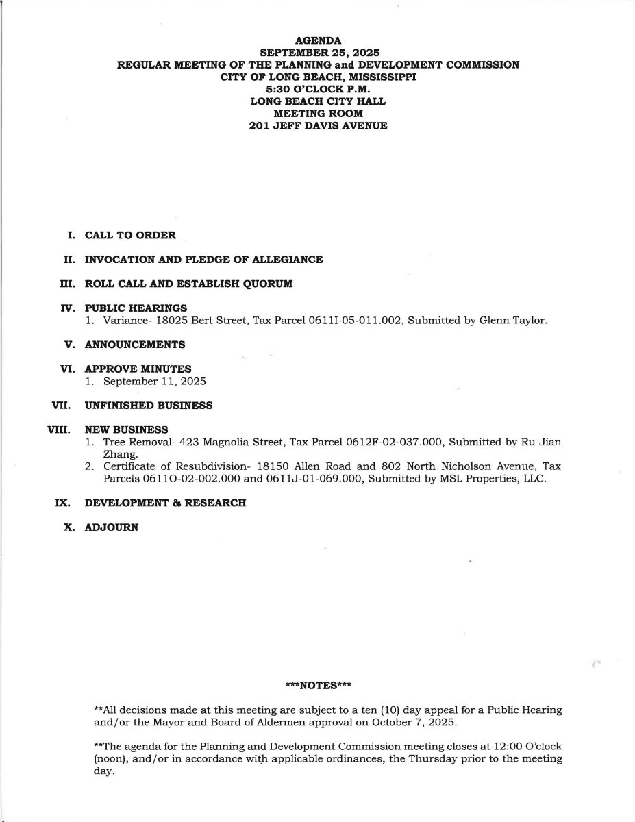 Planning and Development Commission Meeting Agenda, September 25, 2025 By Editor | September 22, 2025 | 0 Planning and Development Commission Meeting Agenda, September 25, 2025 @ 5:30 PM City Hall Meeting Room 201 Jeff Davis Avenue Long Beach, MS 39560 Posted in Breaking News, Planning & Development Leave a Comment Name (required) Email (will not be published) (required) Comment Click here to cancel reply. Related Posts Community invited to gather for National Day of Prayer on May 7 April 23, 2026 | No Comments » GCCF receives Community Foundations National Standards® reaccreditation April 22, 2026 | No Comments » Baleyev assists at State Capitol April 21, 2026 | No Comments » City establishes temporary permit process for existing business containers April 16, 2026 | No Comments » MISSISSIPPI GULF COAST CHAMBER OF COMMERCE OPENS 2026 SMALL BUSINESS GRANT APPLICATIONS April 15, 2026 | No Comments »
