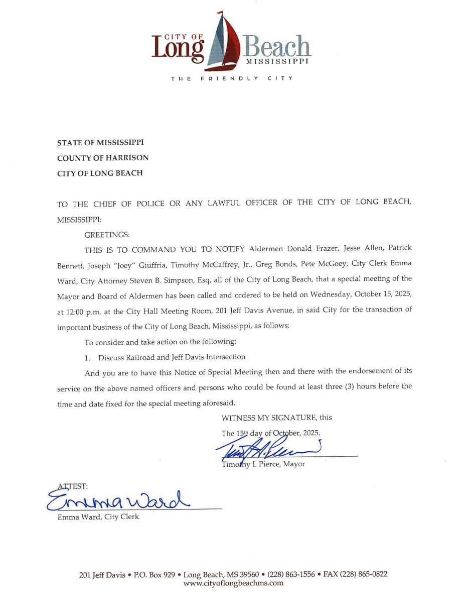 Notice of Special Meeting of the Mayor and Board of Aldermen, October 15, 2025 By Editor | October 15, 2025 | 0 Notice of Special Meeting of the Mayor and Board of Aldermen, October 15, 2025 @ 12:00 PM City Hall Meeting Room 201 Jeff Davis Avenue Long Beach, MS 39560 Posted in Mayor's Board of Aldermen Leave a Comment Name (required) Email (will not be published) (required) Comment Click here to cancel reply. Related Posts Mayor and Board of Aldermen Meeting Agenda for Tuesday, March 17, 2026 March 16, 2026 | No Comments » Mayor and Board of Aldermen Meeting Agenda, Tuesday, February 3, 2026 February 2, 2026 | No Comments » Mayor and Board of Aldermen Meeting Agenda, January 6, 2026 January 6, 2026 | No Comments » Mayor and Board of Aldermen Meeting Agenda, December 16, 2025 December 18, 2025 | No Comments » Mayor and Board of Aldermen Meeting Agenda, December 2, 2025 December 5, 2025 | No Comments »