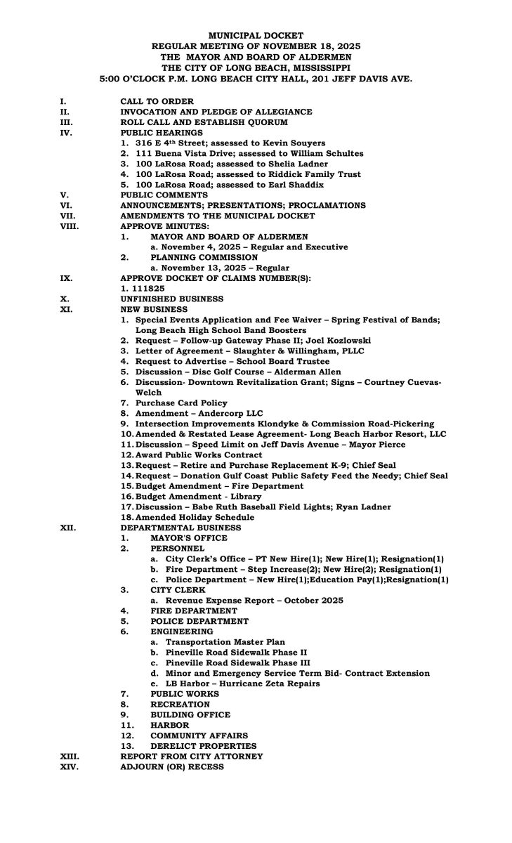 Mayor and Board of Aldermen Meeting Agenda, Tuesday, November 18, 2025 By Editor | November 17, 2025 | 0 Mayor and Board of Aldermen Meeting Agenda, Tuesday, November 18, 2025 @ 5:00 PM City Hall Meeting Room 201 Jeff Davis Avenue Long Beach, MS 39560 Posted in Mayor's Board of Aldermen Leave a Comment Name (required) Email (will not be published) (required) Comment Click here to cancel reply. Related Posts Mayor and Board of Aldermen Meeting Agenda for Tuesday, March 17, 2026 March 16, 2026 | No Comments » Mayor and Board of Aldermen Meeting Agenda, Tuesday, February 3, 2026 February 2, 2026 | No Comments » Mayor and Board of Aldermen Meeting Agenda, January 6, 2026 January 6, 2026 | No Comments » Mayor and Board of Aldermen Meeting Agenda, December 16, 2025 December 18, 2025 | No Comments » Mayor and Board of Aldermen Meeting Agenda, December 2, 2025 December 5, 2025 | No Comments »