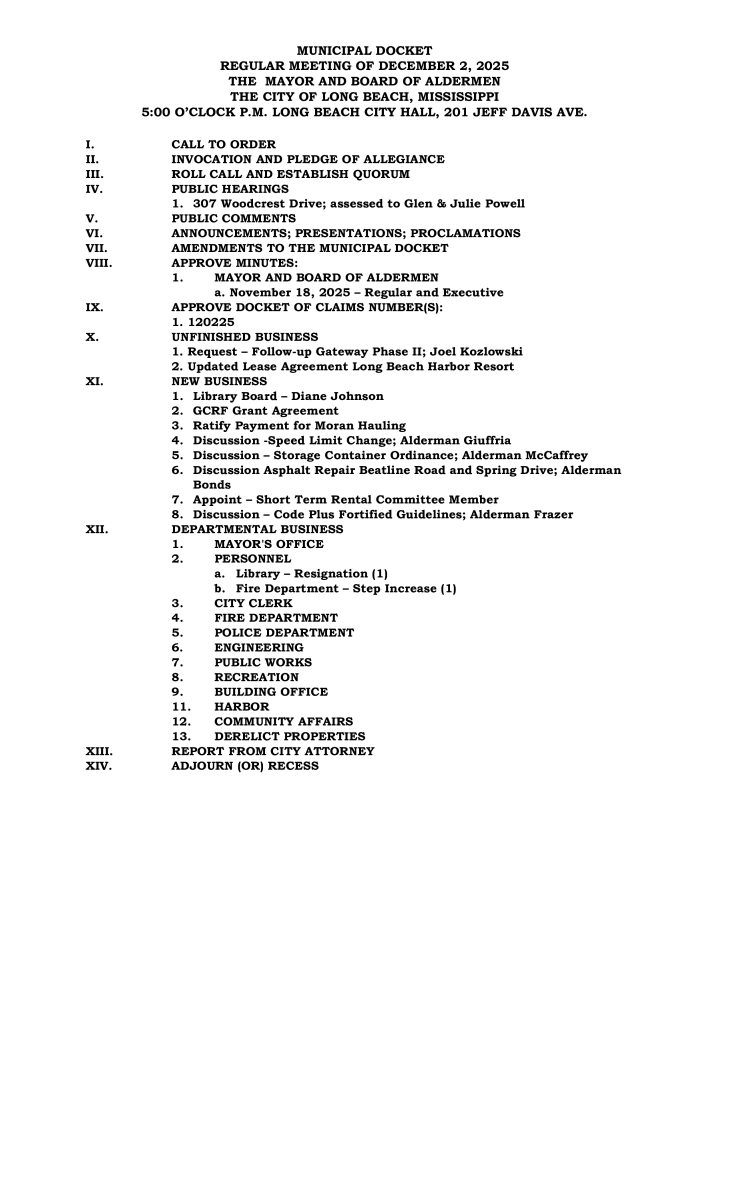Mayor and Board of Aldermen Meeting Agenda, December 2, 2025 By Editor | December 5, 2025 | 0 Mayor and Board of Aldermen Meeting Agenda, December 2, 2025 at 5:00 PM City Hall Meeting Room 201 Jeff Davis Avenue Long Beach, MS 39560 Posted in Mayor's Board of Aldermen Leave a Comment Name (required) Email (will not be published) (required) Comment Click here to cancel reply. Related Posts Mayor and Board of Aldermen Meeting Agenda for Tuesday, March 17, 2026 March 16, 2026 | No Comments » Mayor and Board of Aldermen Meeting Agenda, Tuesday, February 3, 2026 February 2, 2026 | No Comments » Mayor and Board of Aldermen Meeting Agenda, January 6, 2026 January 6, 2026 | No Comments » Mayor and Board of Aldermen Meeting Agenda, December 16, 2025 December 18, 2025 | No Comments » Mayor and Board of Aldermen Meeting Agenda, Tuesday, November 18, 2025 November 17, 2025 | No Comments »