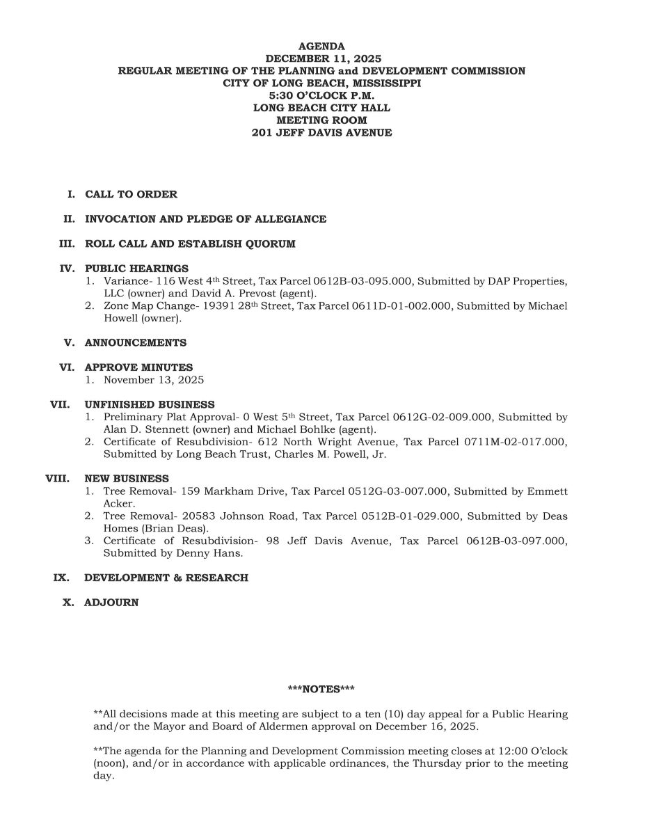 Planning and Development Commission Meeting Agenda, December 11, 2025.