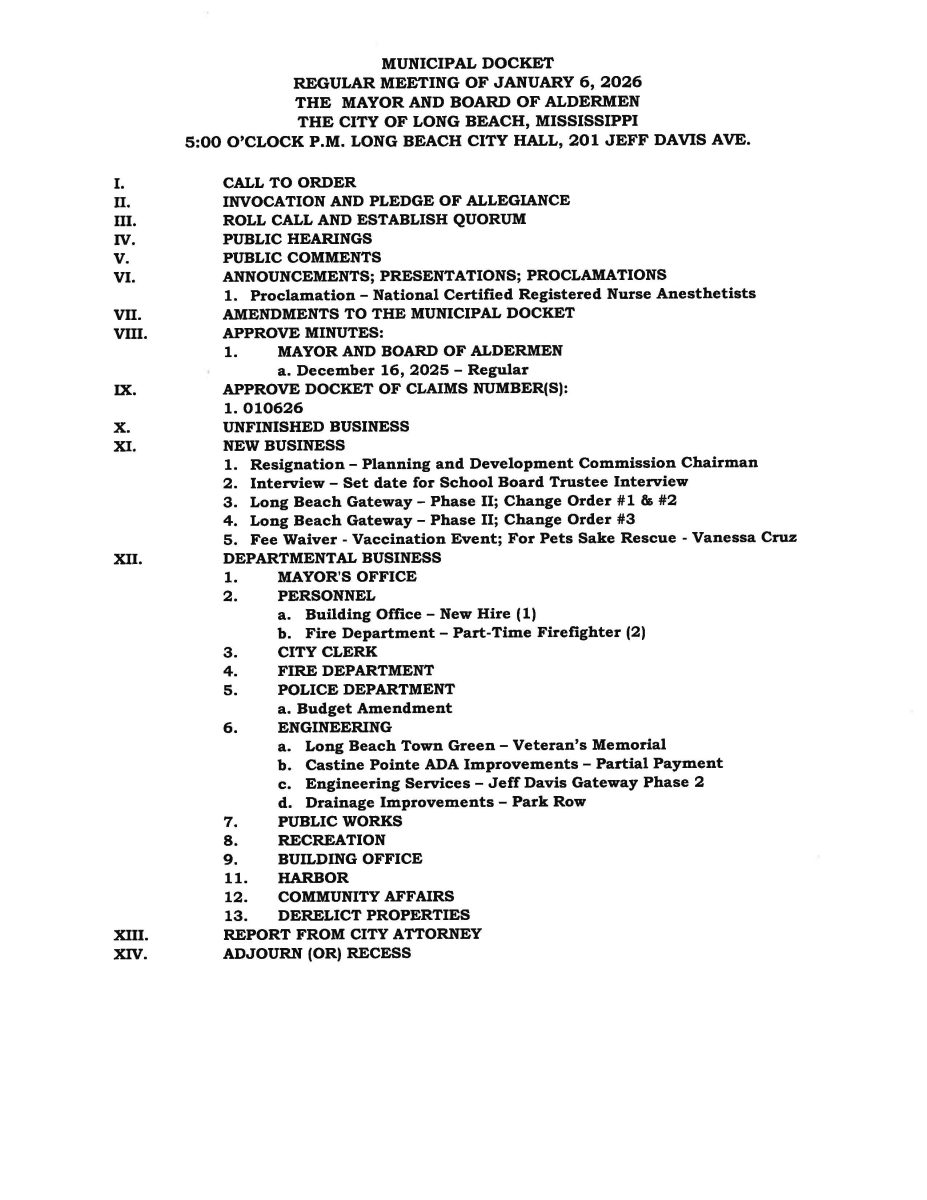 Mayor and Board of Aldermen Meeting Agenda, January 6, 2026 By Editor | January 6, 2026 | 0 Mayor and Board of Aldermen Meeting Agenda, January 6, 2026 @ 5:00 PM City Hall Meeting Room 201 Jeff Davis Avenue Long Beach, MS 39560 Posted in Mayor's Board of Aldermen Leave a Comment Name (required) Email (will not be published) (required) Comment Click here to cancel reply. Related Posts Mayor and Board of Aldermen Meeting Agenda for Tuesday, March 17, 2026 March 16, 2026 | No Comments » Mayor and Board of Aldermen Meeting Agenda, Tuesday, February 3, 2026 February 2, 2026 | No Comments » Mayor and Board of Aldermen Meeting Agenda, December 16, 2025 December 18, 2025 | No Comments » Mayor and Board of Aldermen Meeting Agenda, December 2, 2025 December 5, 2025 | No Comments » Mayor and Board of Aldermen Meeting Agenda, Tuesday, November 18, 2025 November 17, 2025 | No Comments »