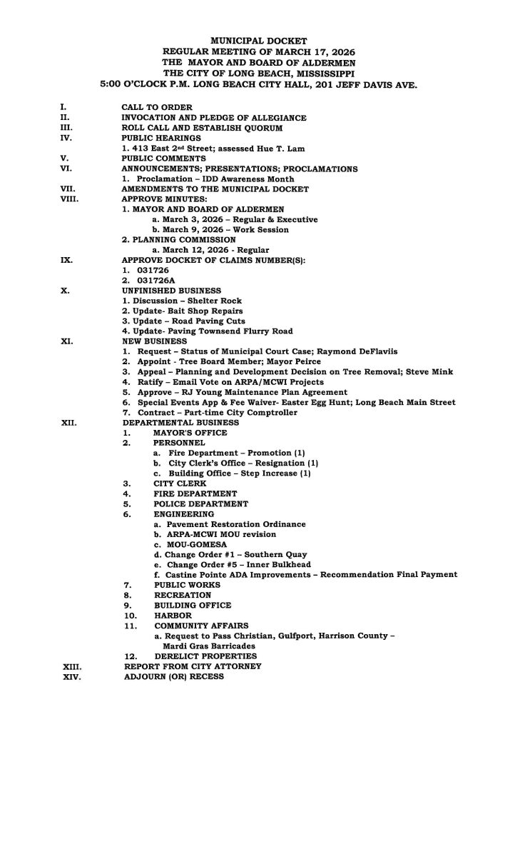 Mayor and Board of Aldermen Meeting Agenda for Tuesday, March 17, 2026 By Editor | March 16, 2026 | 0 Mayor and Board of Aldermen Meeting Agenda for Tuesday, March 17, 2026 @ 5:00 PM City Hall Meeting Room 201 Jeff Davis Avenue Long Beach, MS 39560 Posted in Mayor's Board of Aldermen Leave a Comment Name (required) Email (will not be published) (required) Comment Click here to cancel reply. Related Posts Mayor and Board of Aldermen Meeting Agenda, Tuesday, February 3, 2026 February 2, 2026 | No Comments » Mayor and Board of Aldermen Meeting Agenda, January 6, 2026 January 6, 2026 | No Comments » Mayor and Board of Aldermen Meeting Agenda, December 16, 2025 December 18, 2025 | No Comments » Mayor and Board of Aldermen Meeting Agenda, December 2, 2025 December 5, 2025 | No Comments » Mayor and Board of Aldermen Meeting Agenda, Tuesday, November 18, 2025 November 17, 2025 | No Comments »