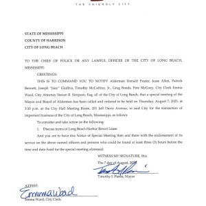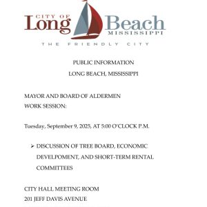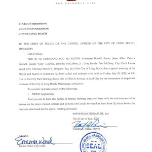Notice of Special Meeting of the Mayor and Board of Aldermen, August 7, 2025 City Hall Meeting Room 201 Jeff Davis Avenue Long Beach, MS 39560