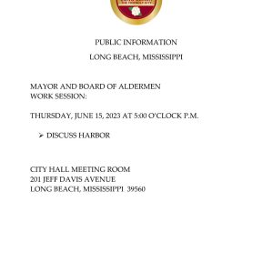 Mayor & Board of Aldermen Work Session Agenda, June 15, 2023, at 5:00 P.M. City Hall Meeting Room 201 Jeff Davis Avenue Long Beach, Mississippi 39560