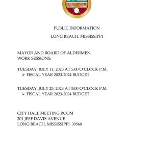 Mayor & Board of Aldermen Work Session Agenda, July 11 & 25, 2023, at 5:00 P.M. City Hall Meeting Room 201 Jeff Davis Avenue Long Beach, Mississippi 39560