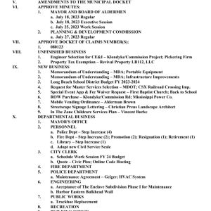 Mayor & Board of Aldermen Meeting Agenda, August 1, 2023, at 5:00 P.M. City Hall Meeting Room 201 Jeff Davis Avenue Long Beach, Mississippi 39560
