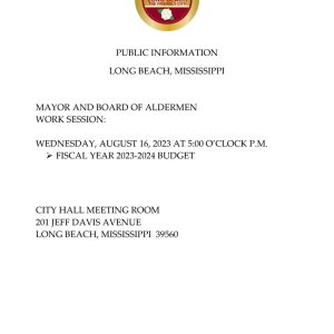 Mayor & Board of Aldermen Work Session Agenda, August 16, 2023, at 5:00 P.M. City Hall Meeting Room 201 Jeff Davis Avenue Long Beach, Mississippi 39560