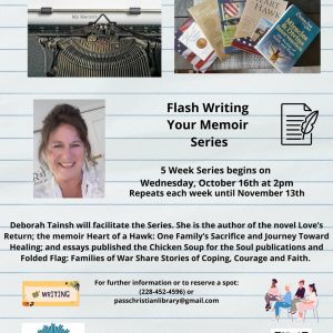 A five-week series, “Flash Writing Your Memoir,” will begin at the Pass Christian Library on Wednesday, October 16. Author Deborah Tainsh will facilitate the …